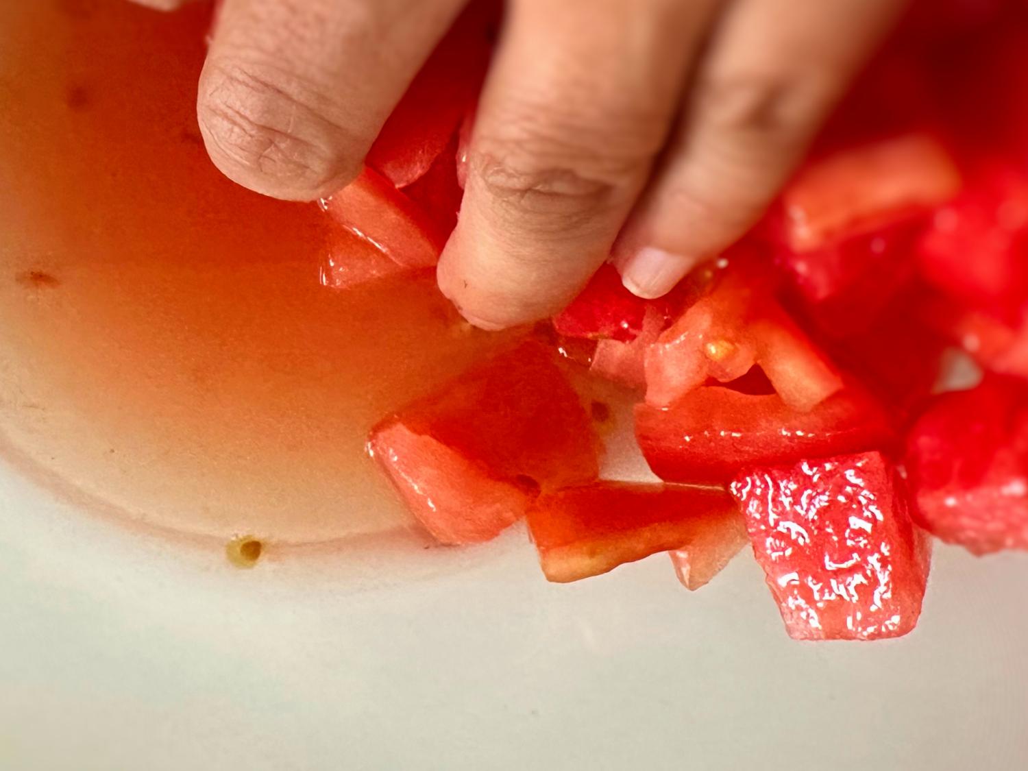 水っぽいトマトが多くなる真夏、スイカの甘さでフォローされ、ちょうどいい塩梅に仕上がるので、朝作っておくと、帰宅後の幸せが約束される?1品。スイカの旬の今こそぜひ。