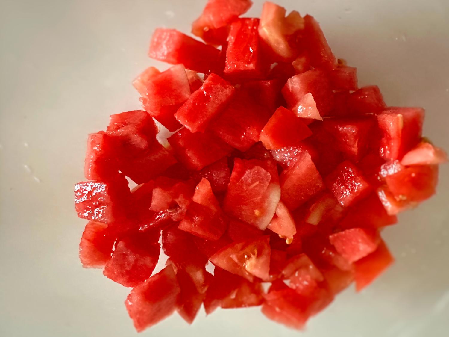 ① スイカとトマトは1口大、1.5センチ角に切る。ボウルに入れ、塩(分量外)を振る。