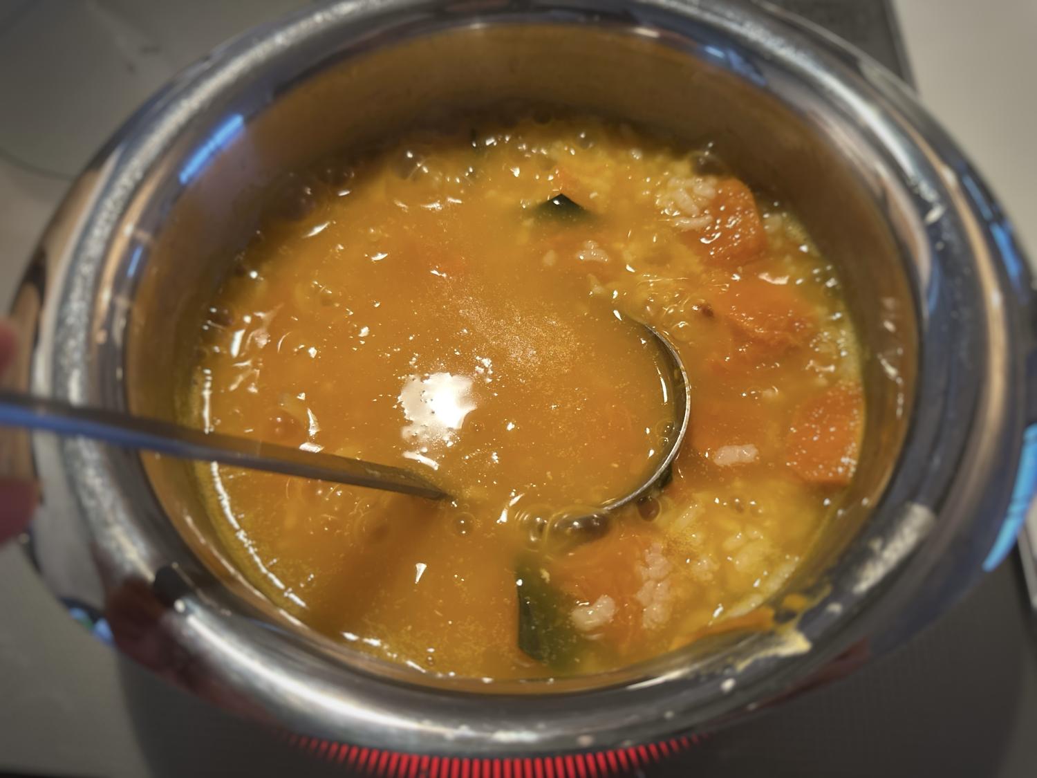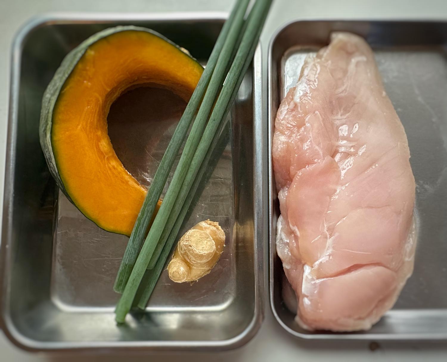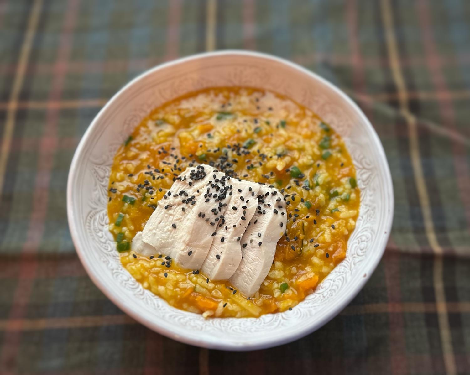 かぼちゃのお粥とサラダチキンを同時に作って、チキンをトッピングしていただきます。残ったサラダチキンは、サンドイッチやサラダに。