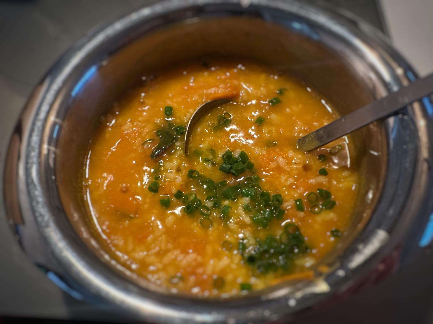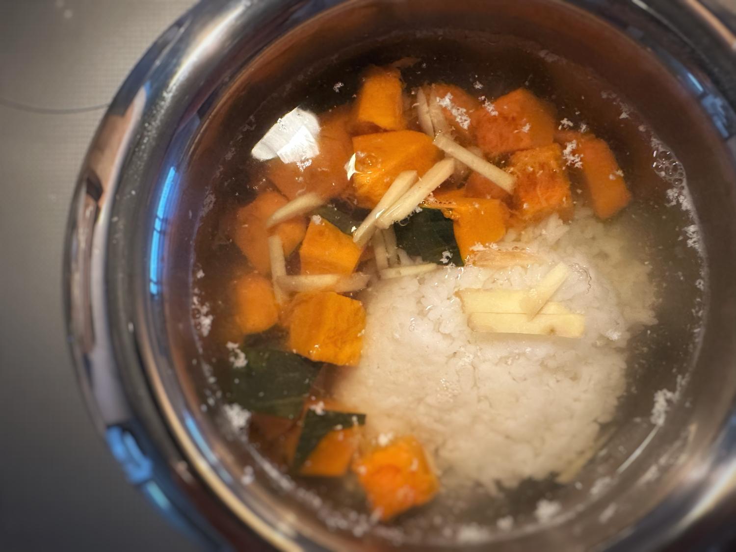 鍋ひとつで、ゆでてサラダチキンをつくり、栄養たっぷりのゆで汁でビタミン豊富なかぼちゃのおかゆをつくる、合理的なレシピです。大人のハロウィンにも。