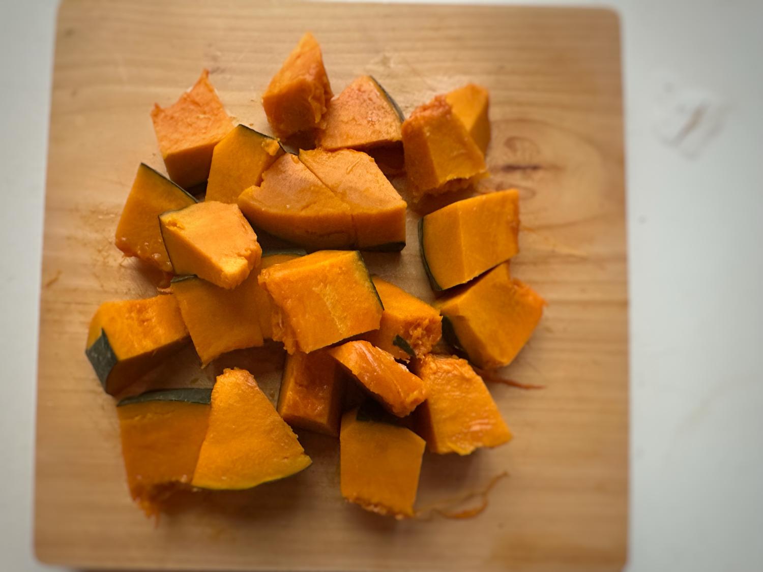 ② かぼちゃは1口大に切る(切りにくい場合は、ラップで包み1,2分レンジにかけるとよい)。しょうがは太めの千切りにする。