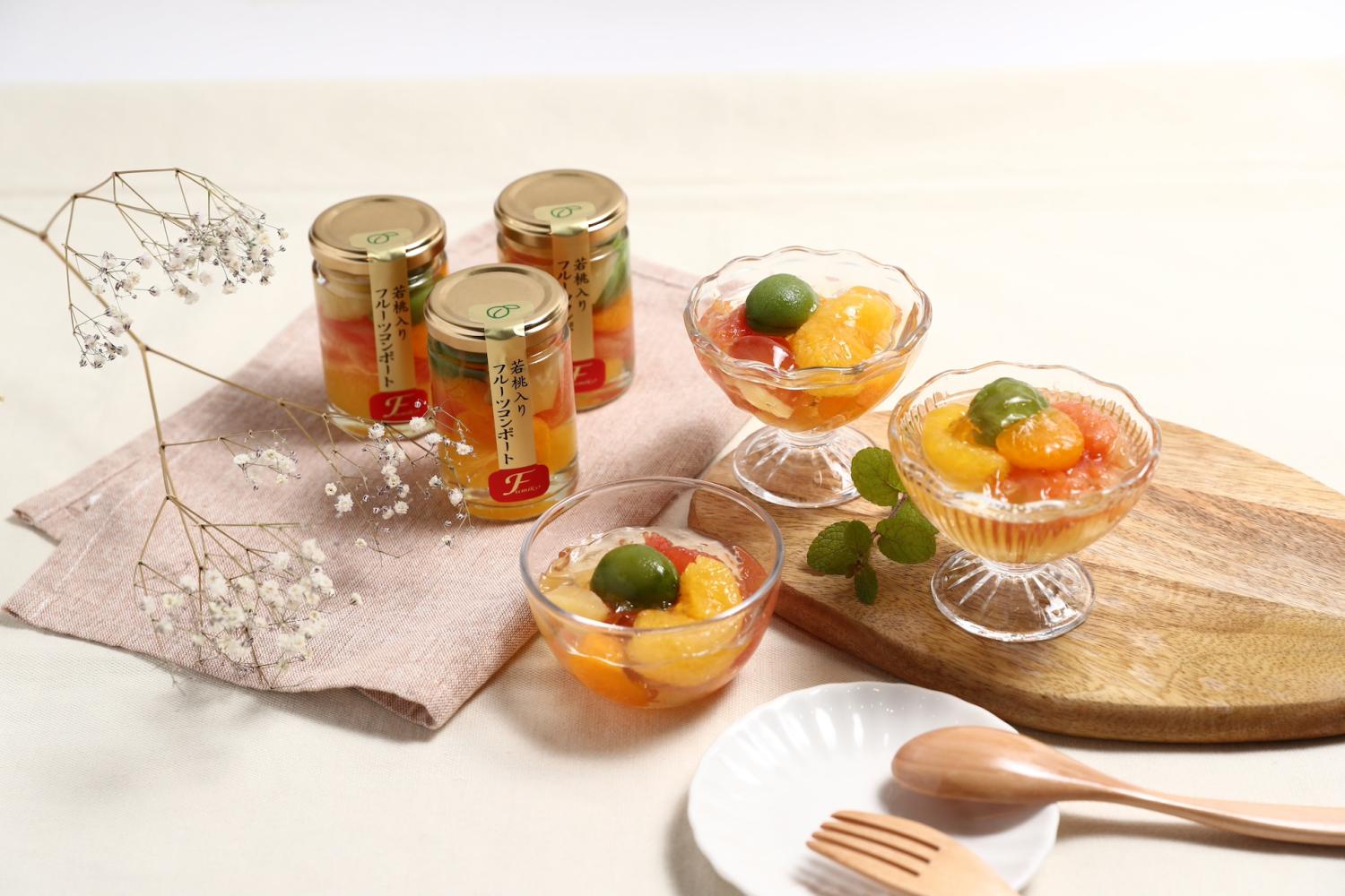 フルーツ王国とも呼ばれる和歌山の、色とりどりの果物がぎっしり詰まった「若桃入りフルーツコンポート」。特にオススメなポイントは、稀少価値の高い翡翠色の「若桃」が入っているところ! それ以外にも、赤、黄、緑と彩りがなんとも華やかで、お祝い事へのギフトにおすすめです!
