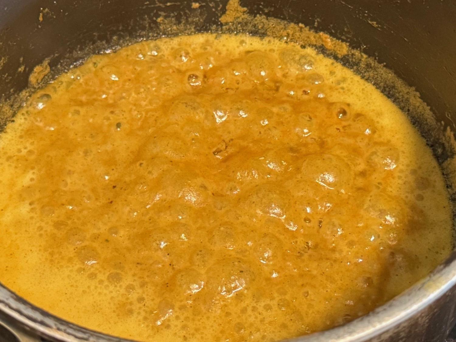 まず、小鍋にココナッツミルクとカレー粉、レモン汁を入れて煮詰めます。目安はココナッツミルク半カップ、カレー粉小さじ1,レモン汁小さじ1弱ですが、辛めがよければカレー粉は大さじ1など調整してください。塩と胡椒も少しずつ加え、時々かき混ぜながら3分の1より少ないくらいになるまで煮詰めます。