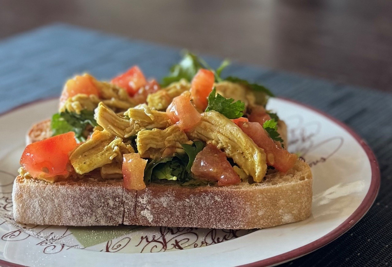 鶏むね肉は蒸して熱いうちに裂いて、ココナッツミルクカレーソースをあえます。そこに小さく切ったトマトとパクチーを加えて全体的に混ぜ、スライスしてトーストしたパンの上にのせました。
