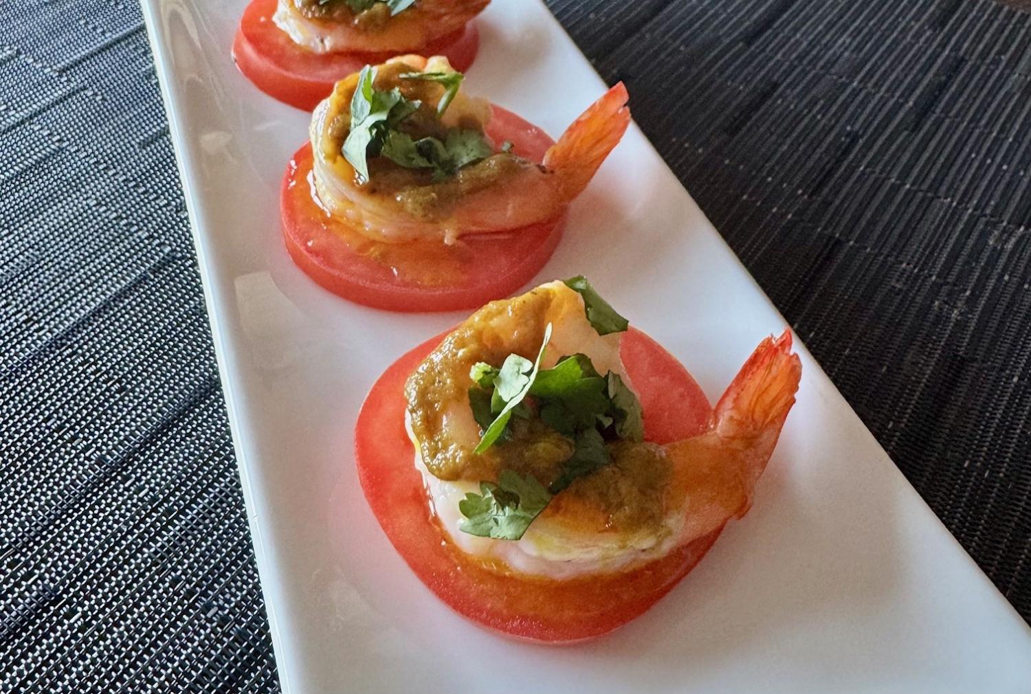 海老は殻と背ワタをとり、軽く塩胡椒してオリーブオイルを熱したフライパンで焼きます。それをスライスしたトマトの上にのせ、ココナッツミルクカレーソースをかけて、上にちぎったパクチーをのせました。白ワインに合いますよ!