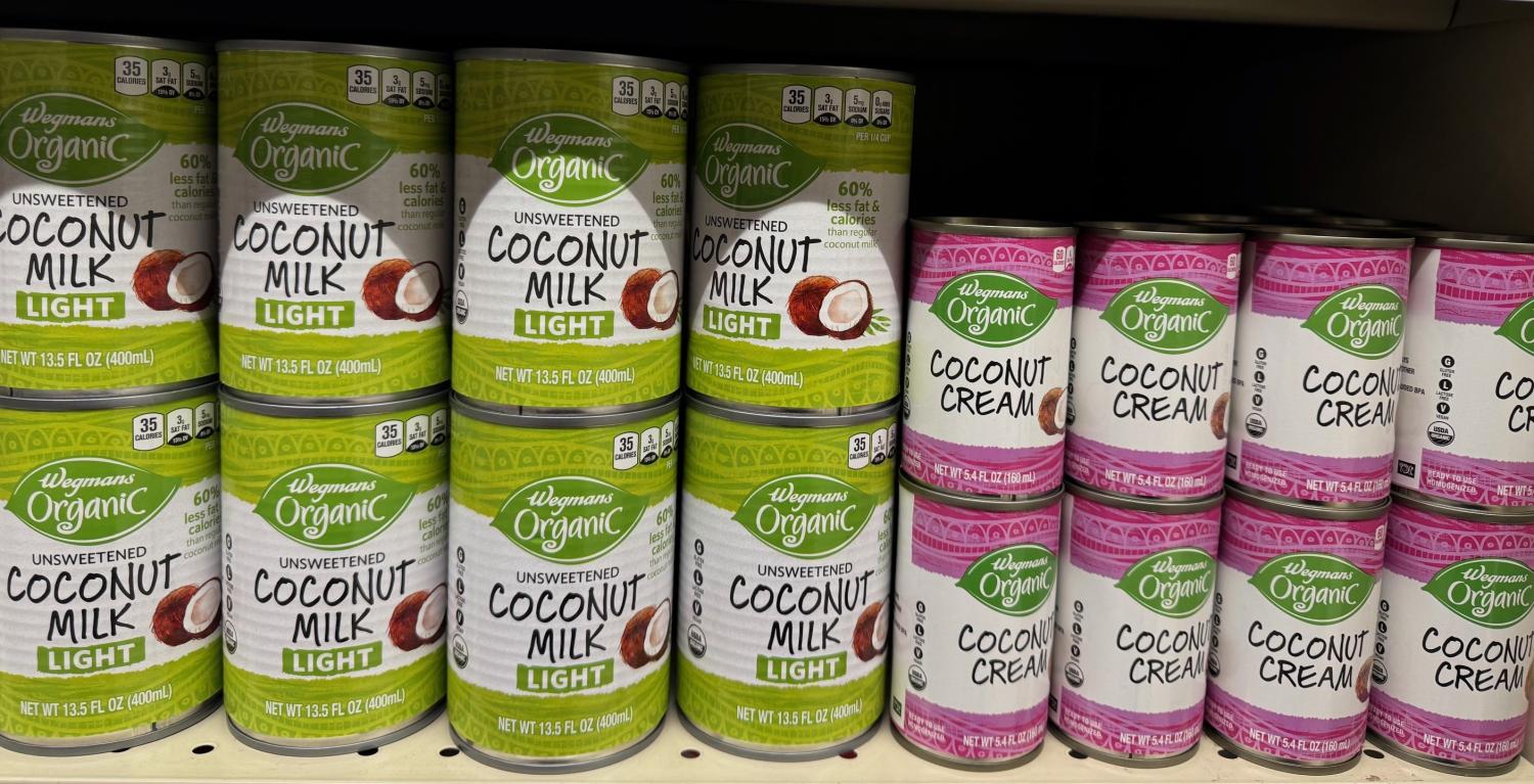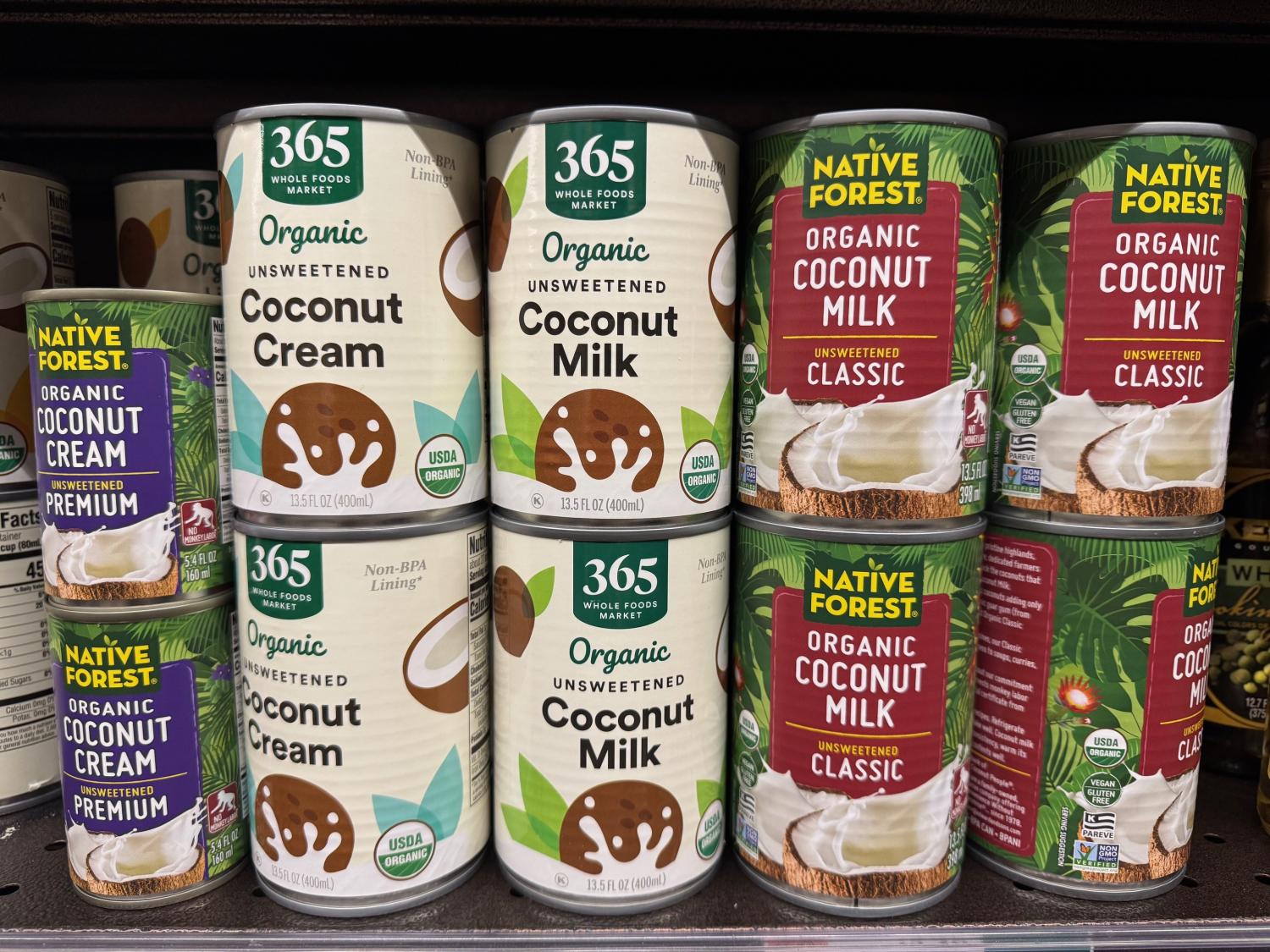 お店に行くと、ココナッツミルク、ココナッツクリーム、そしてライトタイプ、甘味料なしも売っています。基本的にはココナッツクリームの方がココナッツミルクより水分が少なめと言われていますが、私の経験では、ココナッツクリームが特に濃厚という感じではなく、あまり大きな差は感じられません。メーカーにもよるかと思いますので、お好みで選んでいただければと思います。ここでは便宜上、ココナッツミルクとしますが、ココナッツクリームを使っていただいてもまったく問題ありません。ただ私は、ライトタイプだとちょっとコク的に物足りないので、余分な甘みがついていなくてライトタイプでないものを選んでいます。