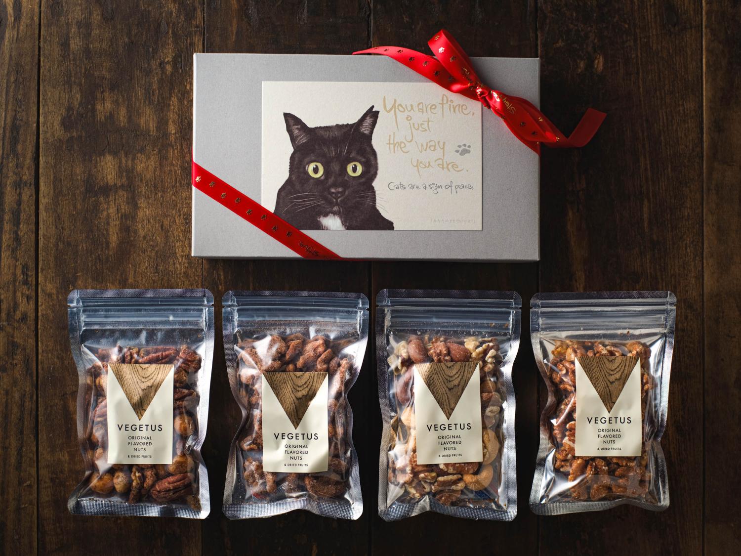 おやつにぴったり4種類セット【メイプルエスプレッソ、ティラミスノーチェ、ハニーロースト、素焼きのミックスナッツ 各50g】/猫ラッピングギフト ¥3,420/ベジタス