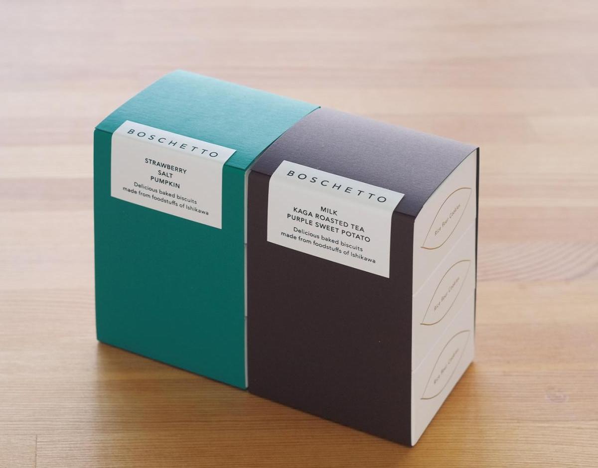 ボスケットグリーンは、石川県産のいちご、能登産の塩、加賀産のかぼちゃを使用した3種のクッキーのミックス。