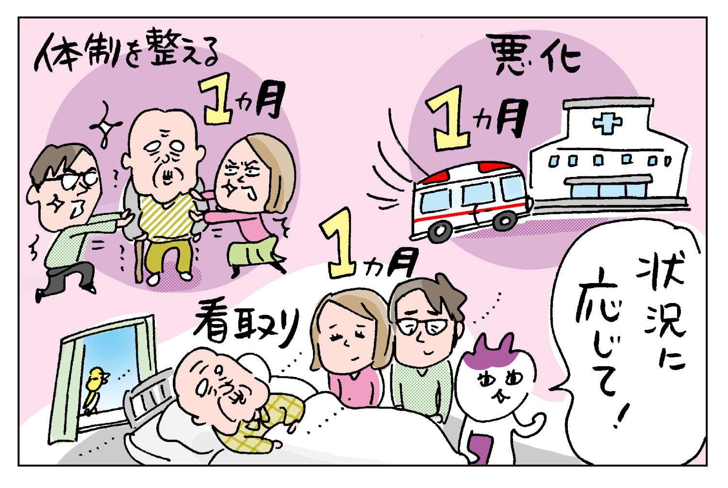 例えば、病院から退院したあとに介護の体制を整えるために1カ月、症状が悪化したときに1カ月、看取りのために1カ月というふうに、状況に応じて取得することが可能です。