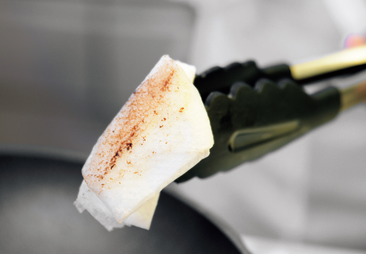 表面をしっかり焦がすよう、強めの中火で。あまり動かさず、余分な黒っぽい脂が出てきたら、ペーパーでこまめにふき取りつつ焼きます。