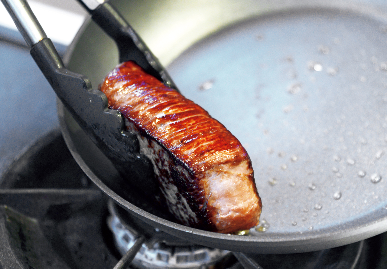 音がまたパチパチと軽くなったら火を落として弱火に。肉の6面すべてに均等に火を入れていくよう、こまめにひっくり返して全体にしっかりとした焼き色を。