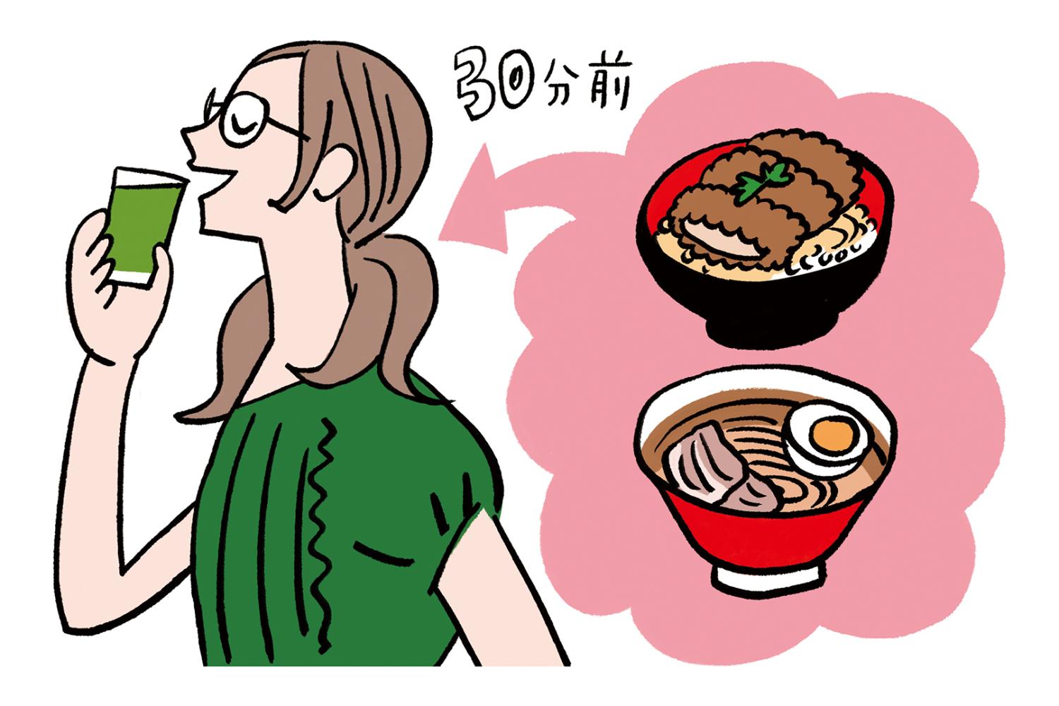 ラーメンやカツ丼などの脂っこいメニューを食べるときには、30分前に野菜ジュースを飲んでおくと、脂肪の吸収を抑えることができておすすめです」