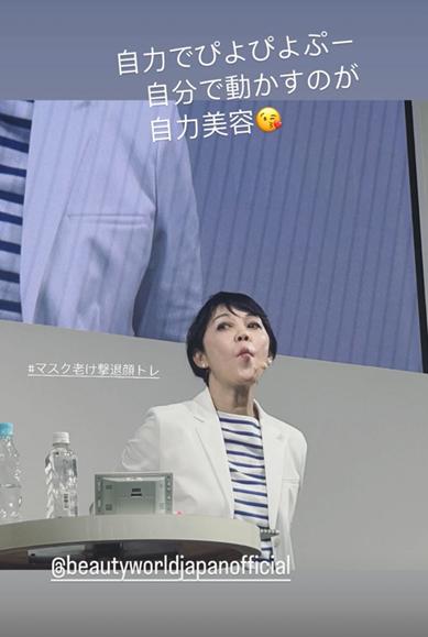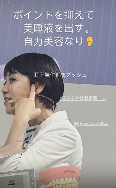 人の集まる場所で登壇するのは久しぶりで、とても新鮮な気持ちに。講演のタイトルは、「たるみ、二重あご、唇の老化。顔下半分の老けを自力でオフ! 顔トレ&美容ケア」です。