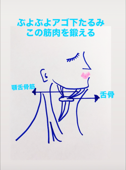 会話をしたり、お水を軽く飲んだりした時に動くアゴの下の筋肉、顎舌骨筋。この筋肉は、アゴを下に下げる働きもします。この筋肉が弱くなると、血流が滞り、老廃物が貯まりやすくなり、ぶよぶよ脂肪に変わっていきます。