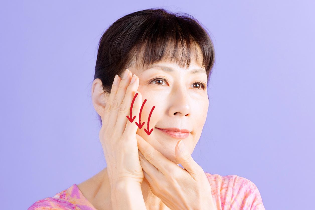 右手の指をこめかみに当てて、軽く引き上げるようにし、左手で頬骨の上からあごまで優しくなで下ろします。少しずつ位置を変えて、頬全体を行います。
