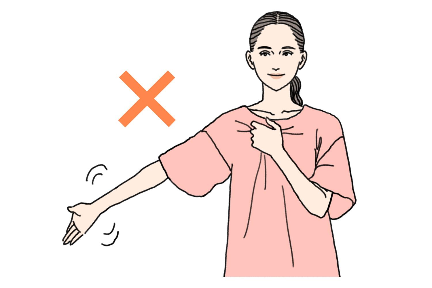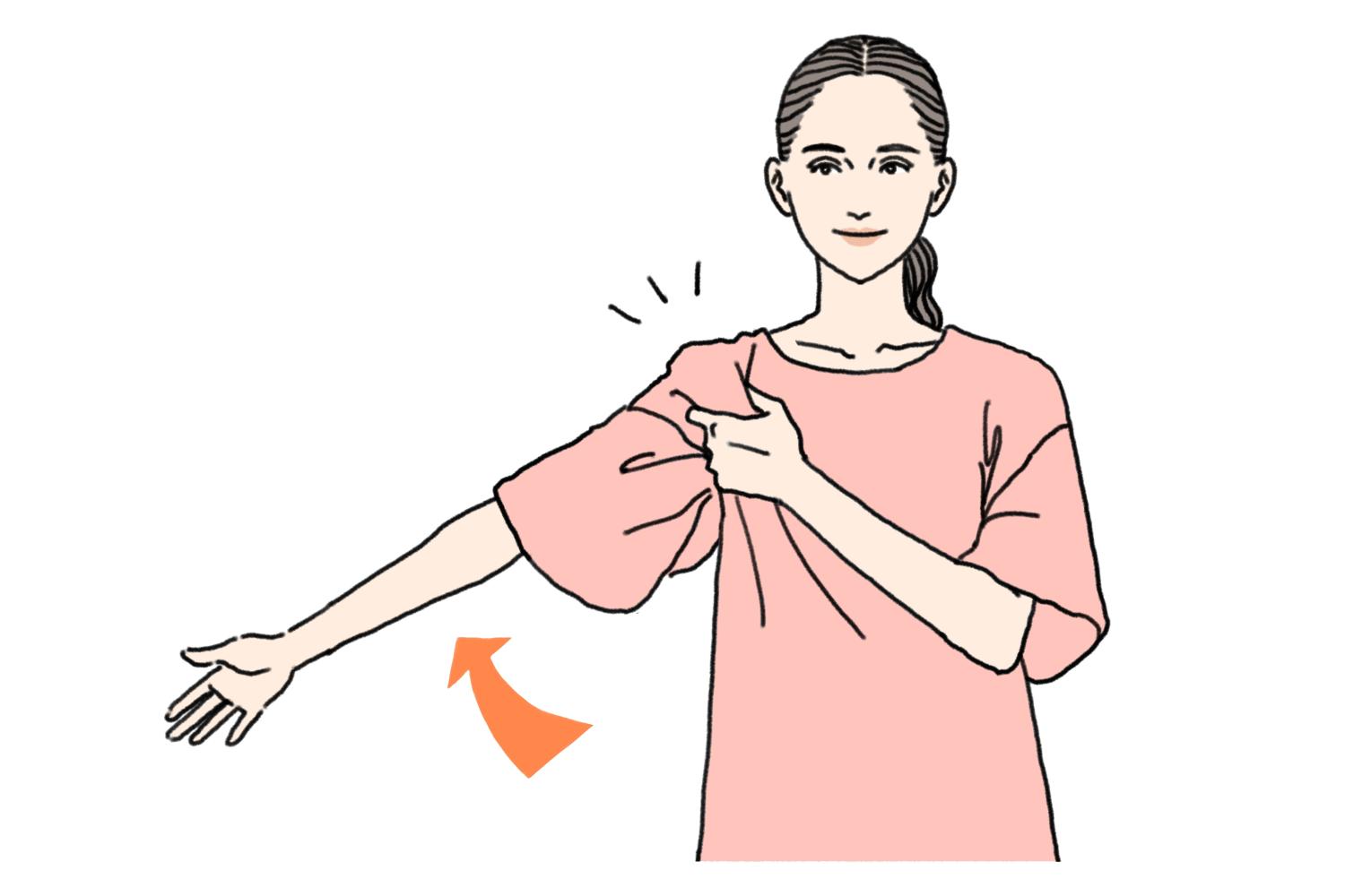 ① 左右どちらかの大胸筋を反対側の手でつかみ、伸ばしたほうの手を下から45度くらいに開き、やや後ろに引く。