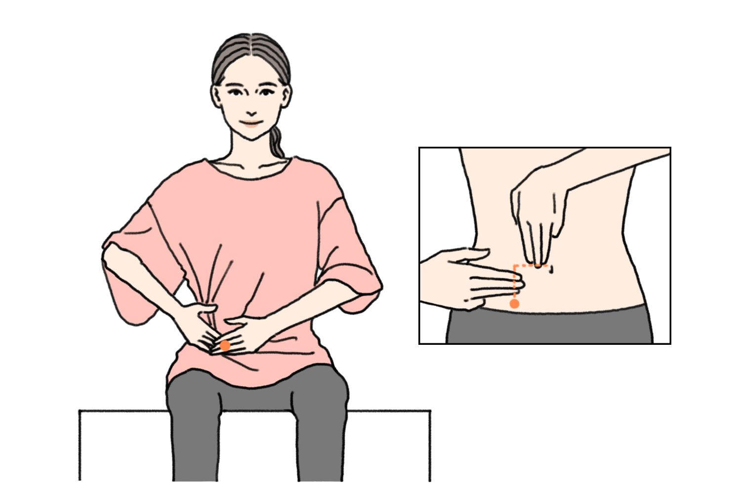 ① おへそから外に指3本分、下に指3本分の場所を両手で押さえる。