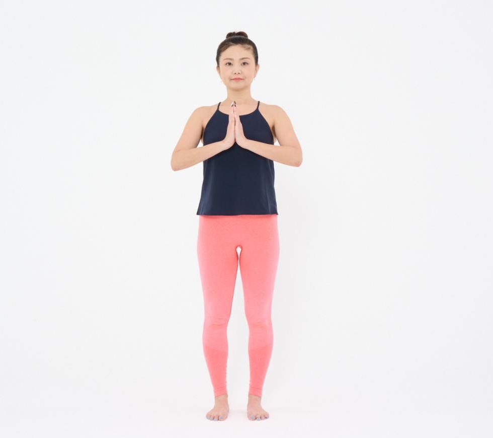 ① 足を軽く開いて真っすぐに立ち、胸の前で手のひらを合わせます。