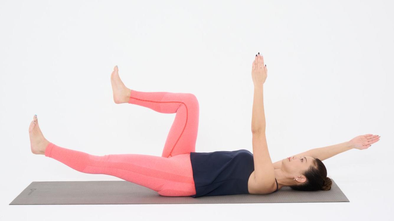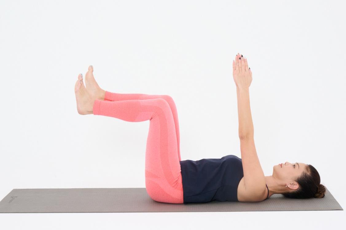 ① あお向けになり、両脚を上げて膝と股関節を90度に曲げ、両腕は真っすぐ上に伸ばし、お腹をぺたんこにします。