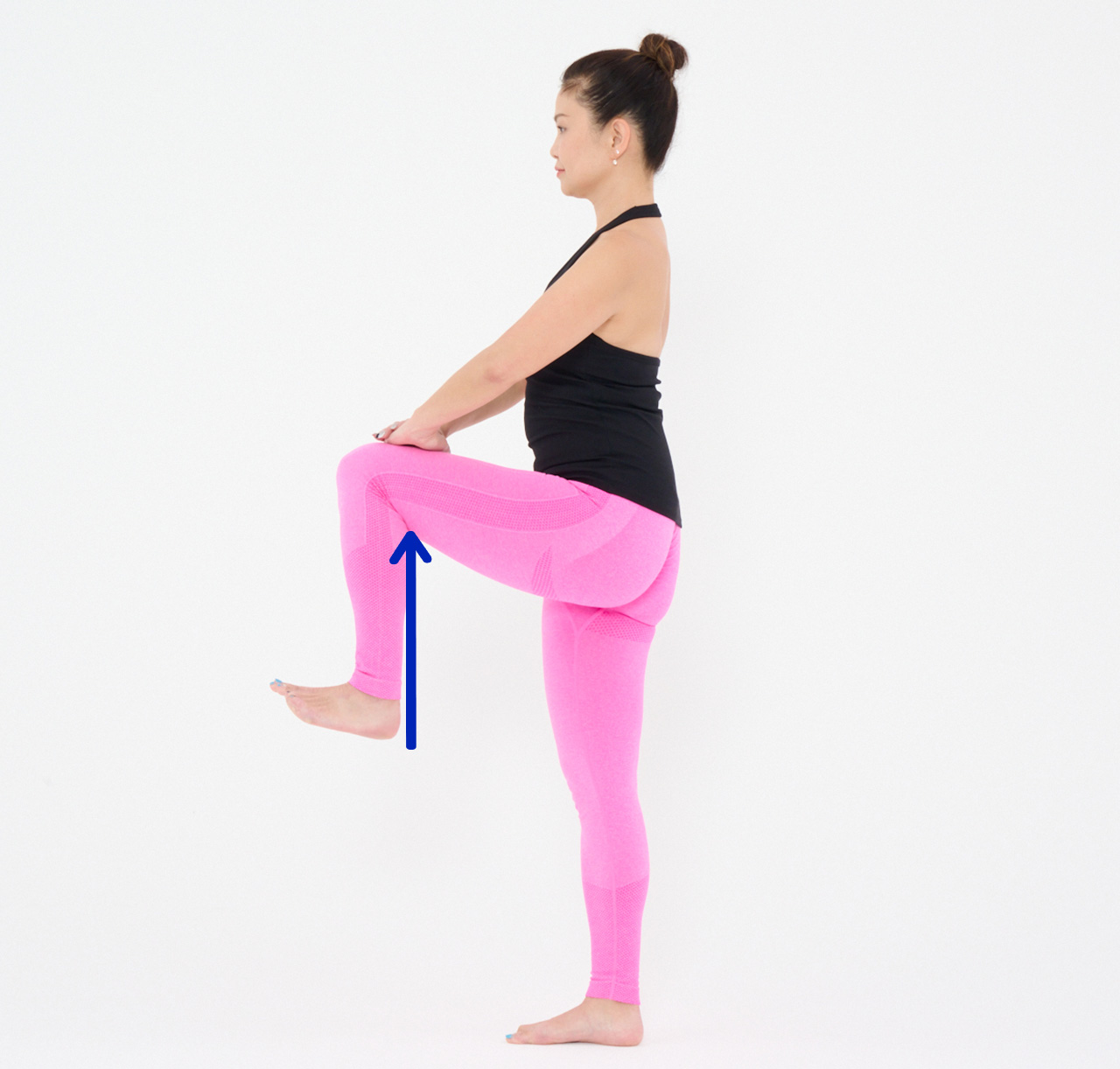 寝た状態でのエクササイズができるようになったら、立った状態でもも上げをしてみましょう。腸腰筋をより鍛えることができ、段差がスムーズにまたげるようになります。体がぐらつく人は、壁に手を置いて行いましょう。