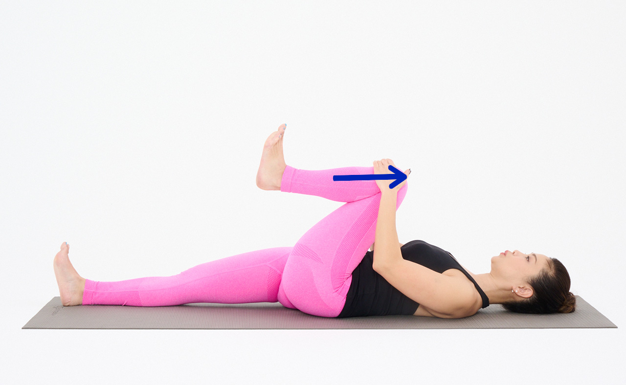 ② 息を吐きながら、片膝を曲げて両手で抱え、そのまま2秒キープ。抱えていないほうの膝はなるべく伸ばします。鼻から息を吸いながら、ゆっくりと元に戻します。反対側も同様に。左右各5回。