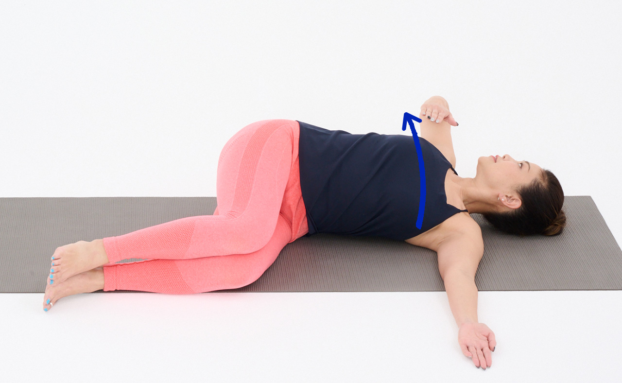 ① 横向きに寝て、股関節、膝をそれぞれ直角に曲げます。両腕は真っすぐ前に伸ばして手のひらを合わせます。