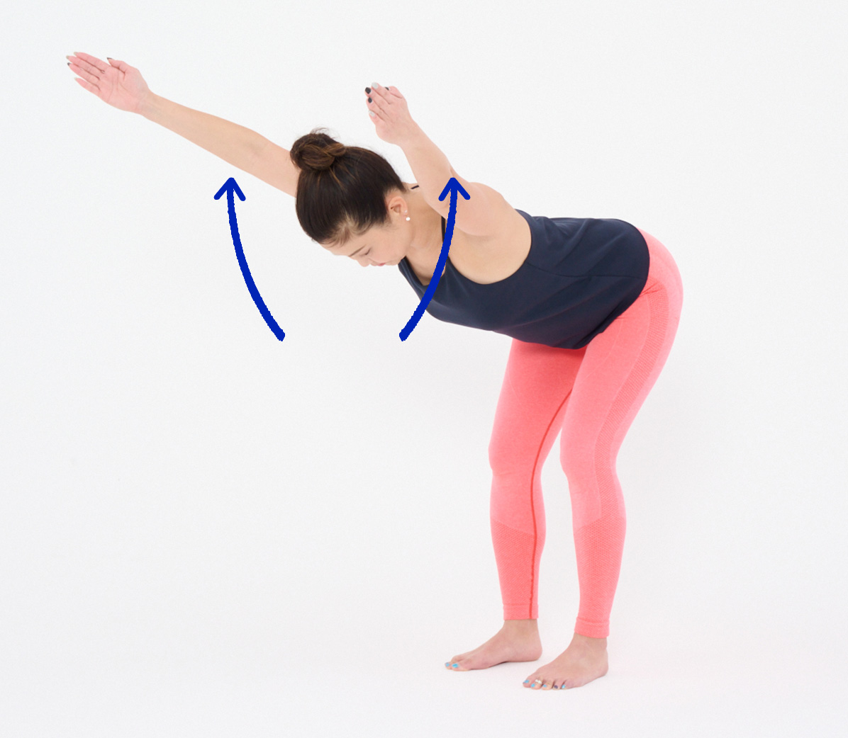 股関節から上体を前に倒して、背中を真っすぐに保った状態で、腕でYの字を作るように上げることで、背中の筋肉を鍛える効果が大。