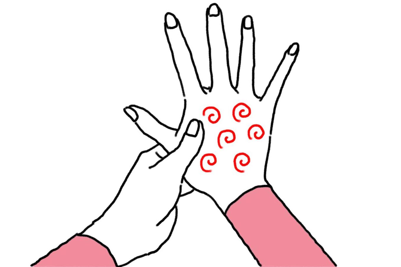 1 片方の手の甲をもう片方の手の親指で、小さな円を描くようにマッサージします。描く方向は右回りでも左回りでもOK。皮膚と骨の癒着を外していくイメージで行ってください。