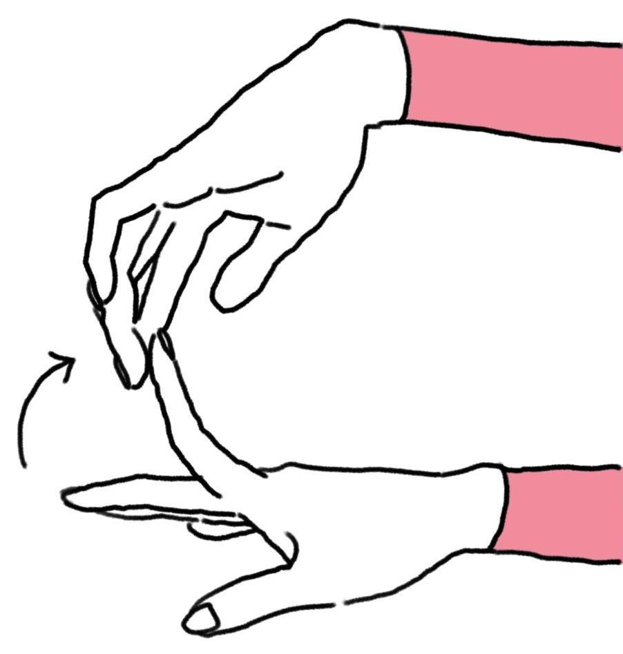 1 片方の手の指でもう片方の手の人差し指を、ゆっくり反らせます。