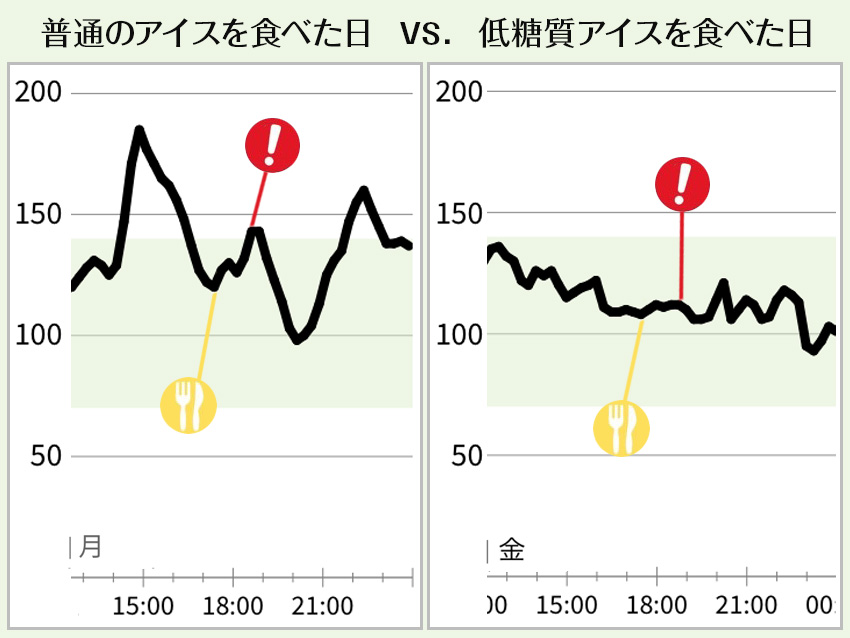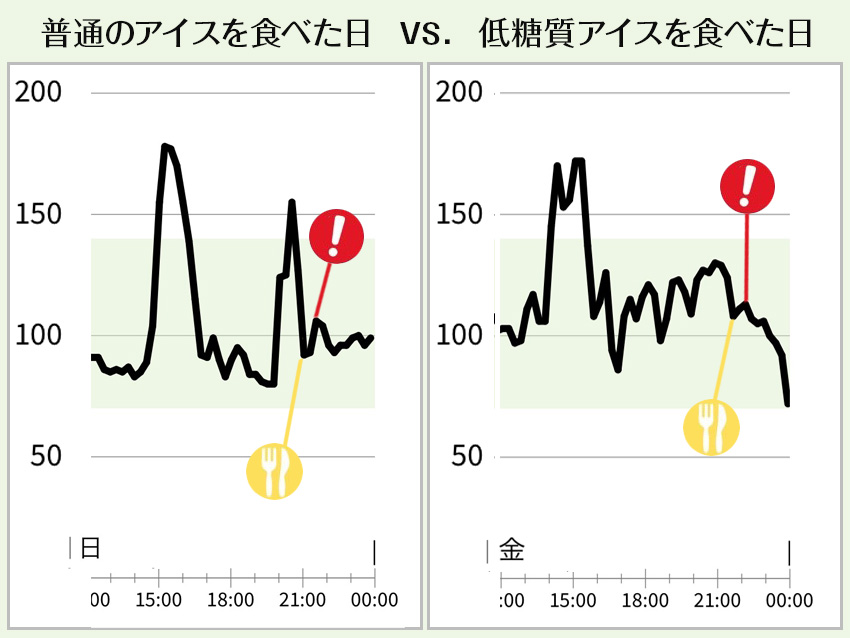 左:21:00に普通のアイスを食べたあと、血糖値が20㎎/dLほど上昇。