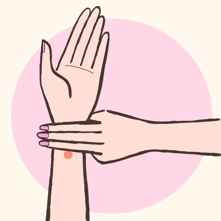 内関の場所は、手首の内側で手を曲げたときにできるシワから指3本分、腕側に上がったところ。2本の腱の間になります。ここをもう片方の手の親指の腹で、軽く円を描くように刺激します。強すぎると逆効果になることもあるので、あくまで気持ちがいい圧で行うのがコツです。