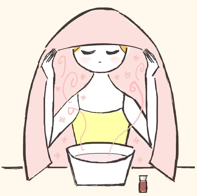 蒸気浴の方法は、洗面器に熱い湯を張り、好みの精油を1~2滴垂らします。イラストのようにタオルを頭にかぶり、この状態から顔を洗面器に近づけます。顔と洗面器の距離は10㎝くらい、タオルでドームを作り湯気が逃げないようにして、目を閉じて、ゆっくり深呼吸をしながらその蒸気を吸い込みます。