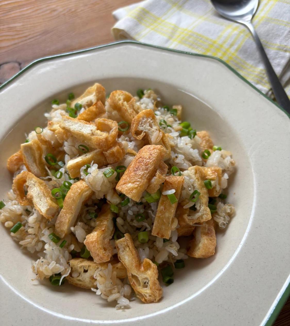「油揚げをフライパンで焼くと、じんわり油が出てきます。この炒飯は、このときに出た油を利用し、油を最小限に抑えて作ります。油揚げの植物性タンパク質に加え、じゃこで動物性タンパク質とカルシウムをプラス。白米に加えたもち麦も加わり、食感豊かな香ばしいひと皿に!」(沼津りえさん)