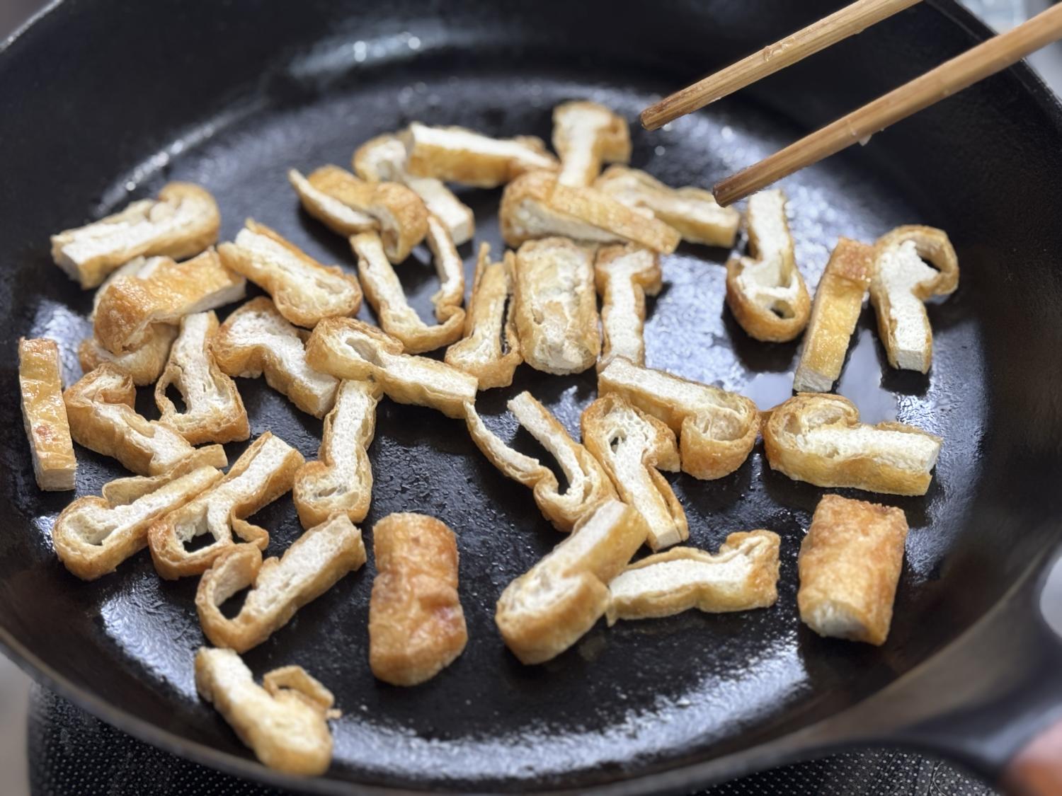 油揚げは油をひかずにカリカリに焼くと、油の量を最小限にすることができます。