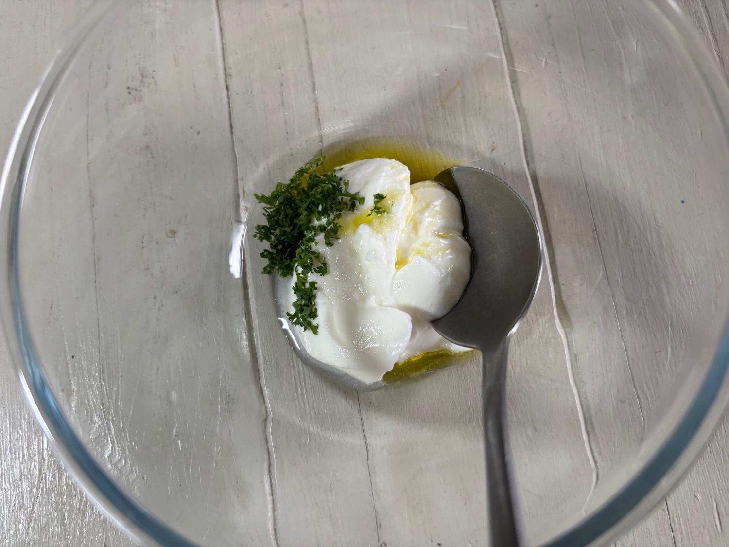 無糖ヨーグルトとオリーブ油、パセリを混ぜたソースは、添えた野菜のドレッシングとしても活躍。低カロリー、低糖質なので安心です。