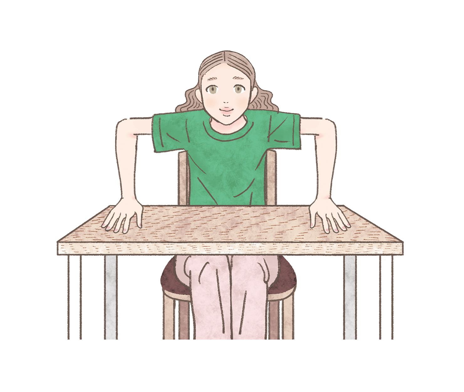 両ひじを直角に曲げてテーブルに手をつき、上体を斜め45度に前傾させます。