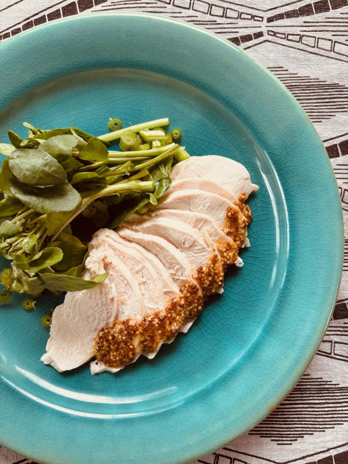 しっとりとした食感で、鶏肉の旨味がじんわりと広がる料理です。マスタードソースの香ばしさがアクセントに。サンドイッチに入れてもおいしそうです。