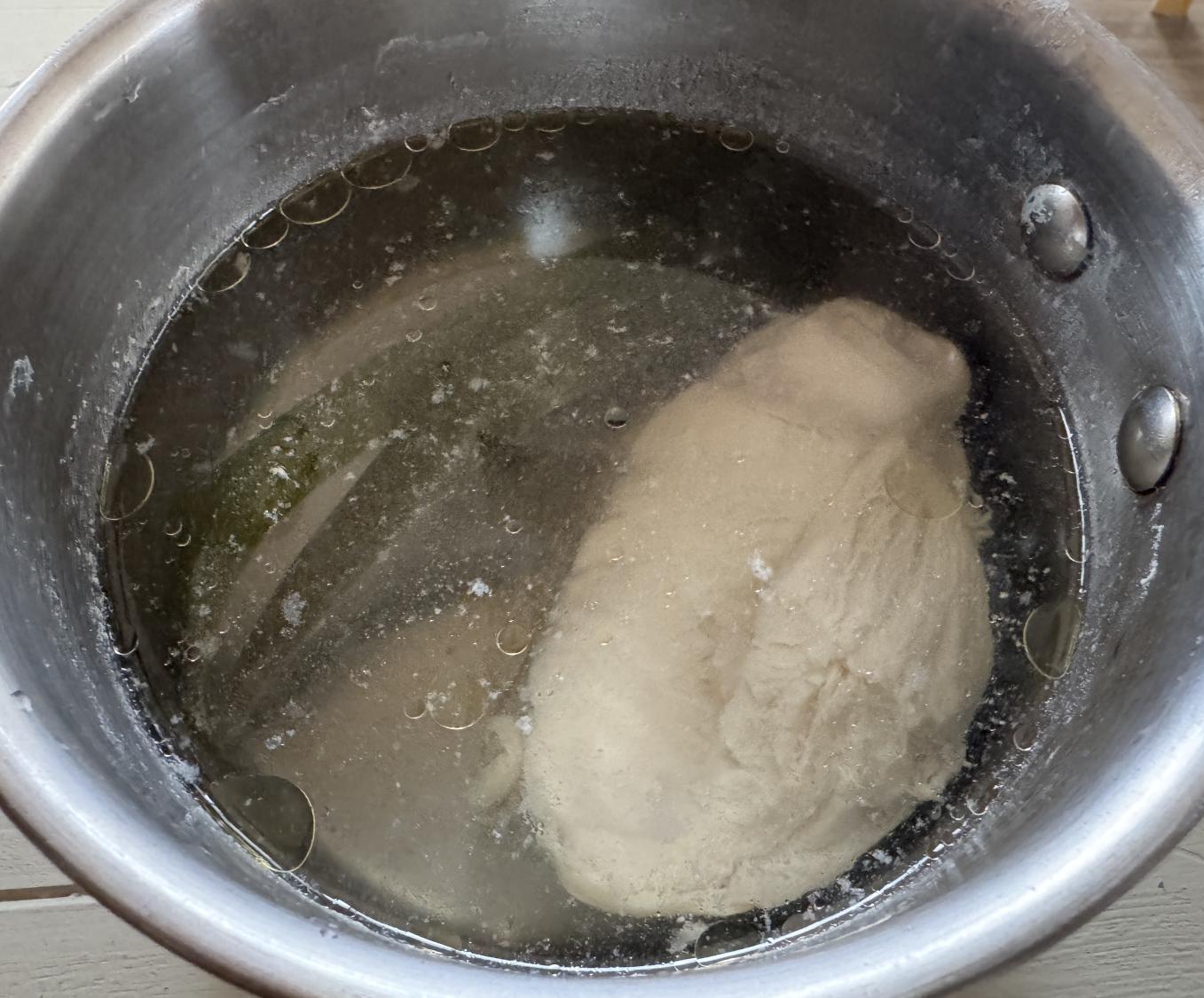 鍋に鶏胸肉と長ねぎの青い部分、水を入れて、水からゆでるのがポイントです。沸騰したら中弱火にして、ブクブクさせない程度の火加減でゆでます。