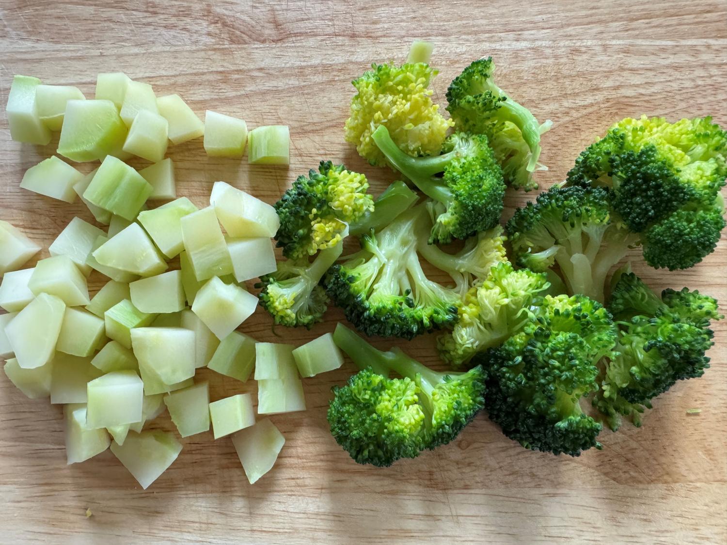 ブロッコリーの茎は粗めの角切りに、花蕾は小房に分けて、あえて食べ応えを残します。これにより早食いや食べすぎの防止に。