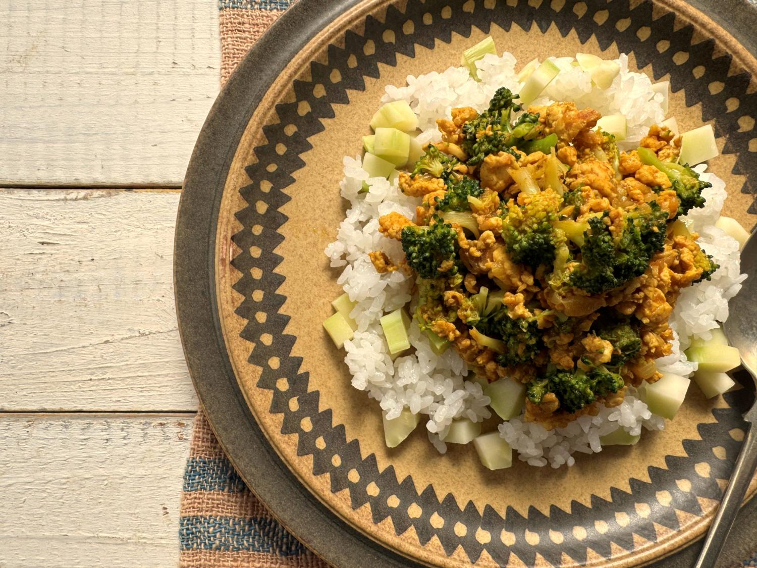 キーマカレーに使用する肉は、脂肪分が少なく低カロリーの鶏ひき肉を使用。ブロッコリーの花蕾(からい・つぼみの部分)はカレーに、捨ててしまいがちな茎はご飯に混ぜて、丸ごと使います。こうして、ブロッコリーを活用することで、肉やご飯の量を抑えて全体のカロリーをかなり低くすることができます」(沼津りえさん)