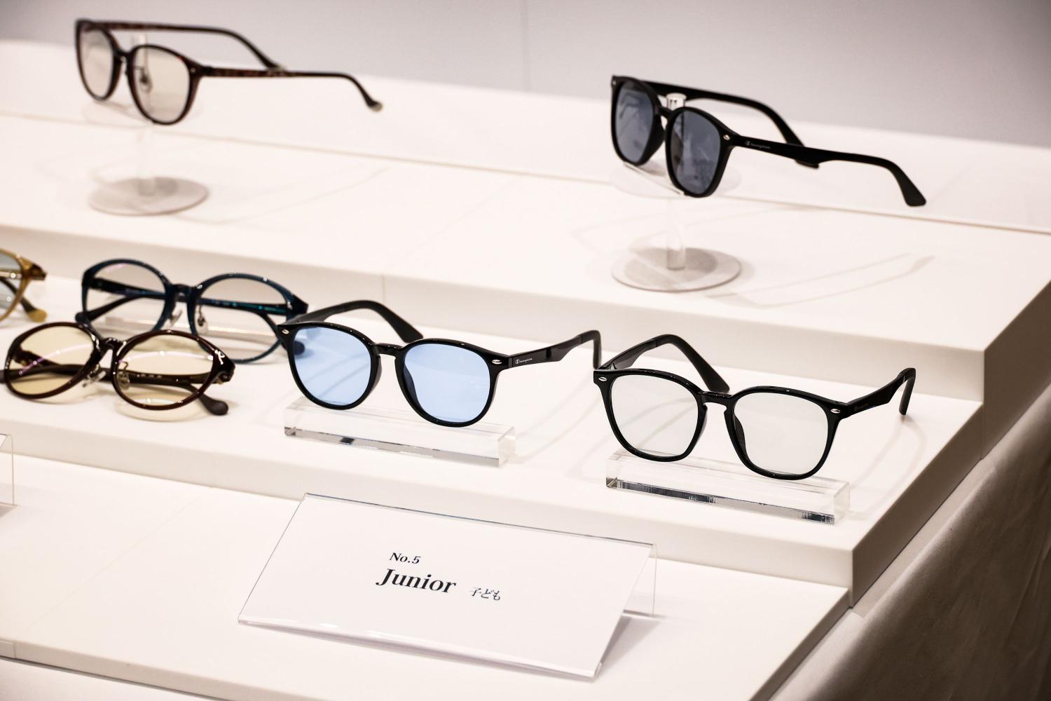 子ども用サングラス ラインアップ展示。子ども用サングラスにも、色なしのパーフェクトUVブロックレンズ搭載モデルあり