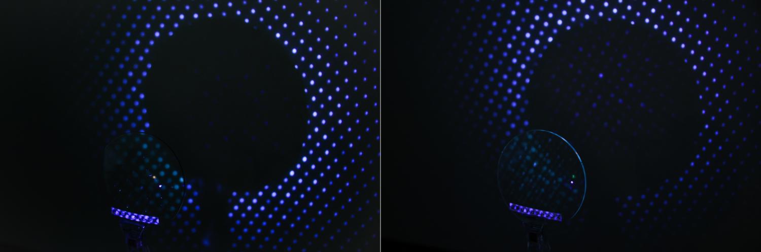 下の写真の左がパーフェクトUVブロックレンズ、右が従来のレンズです。手前から紫外線を照射し、レンズの影が丸く投影されています。