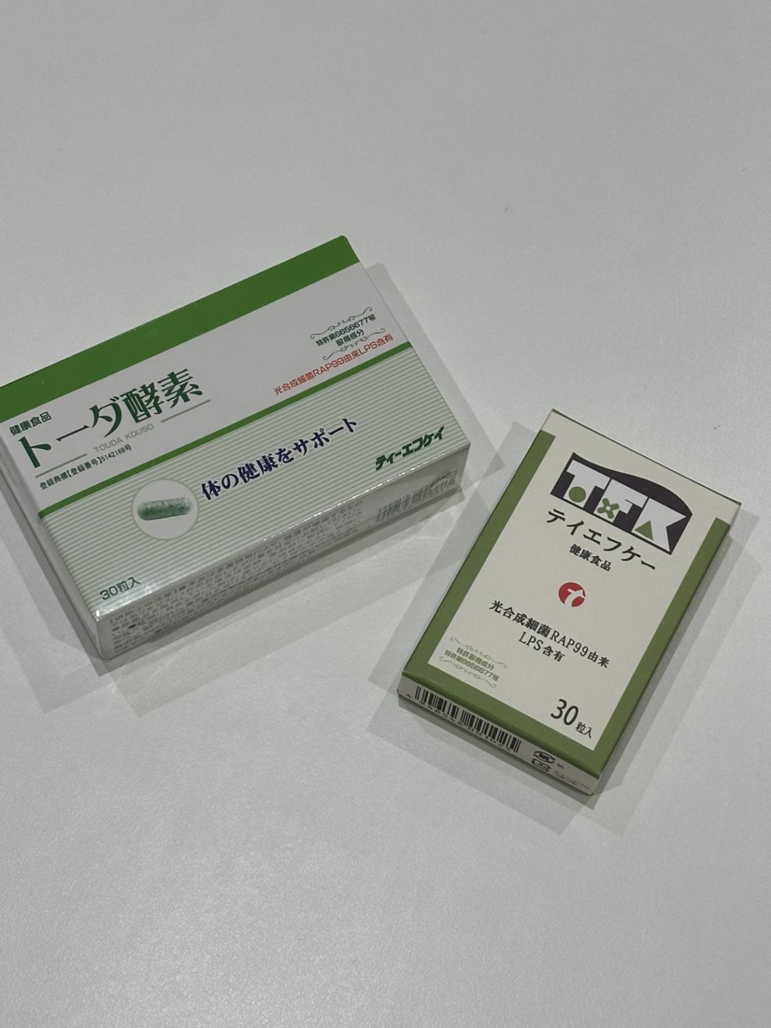 「空腹時に、時々トーダ酵素をとります。これは免疫力アップをサポートし、酸素がない状態でも光合成ができる光合成細菌を活用した酵素です。他にこういうサプリはなかなかありません。また、朝とるのはアスコルバイオのビタミンCです。ビタミンCは基本的には2~3時間で体外へ排出されてしまうのですが、このビタミンCは体の中に6時間も保有してくれるという特許を持っています」