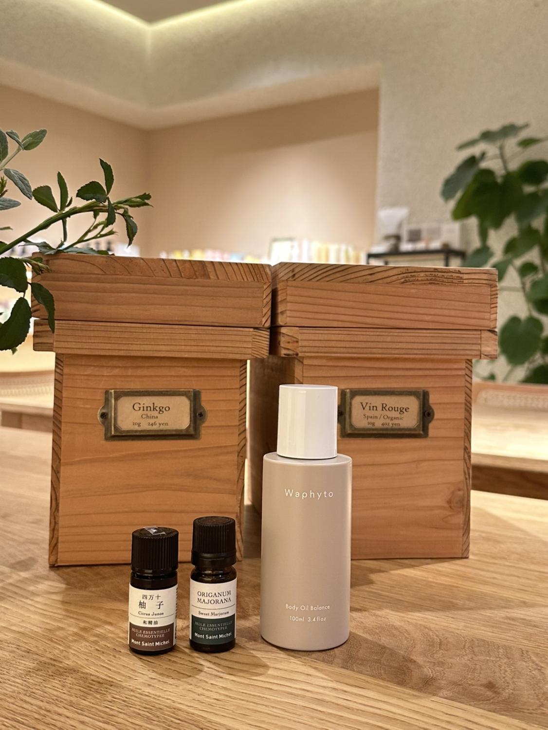↑森田さんがいつも愛用している、ヴァンルージュやギンコのハーブティーとマジョラムとゆずのエッセンシャルオイル、Waphytoのボディオイルバランス