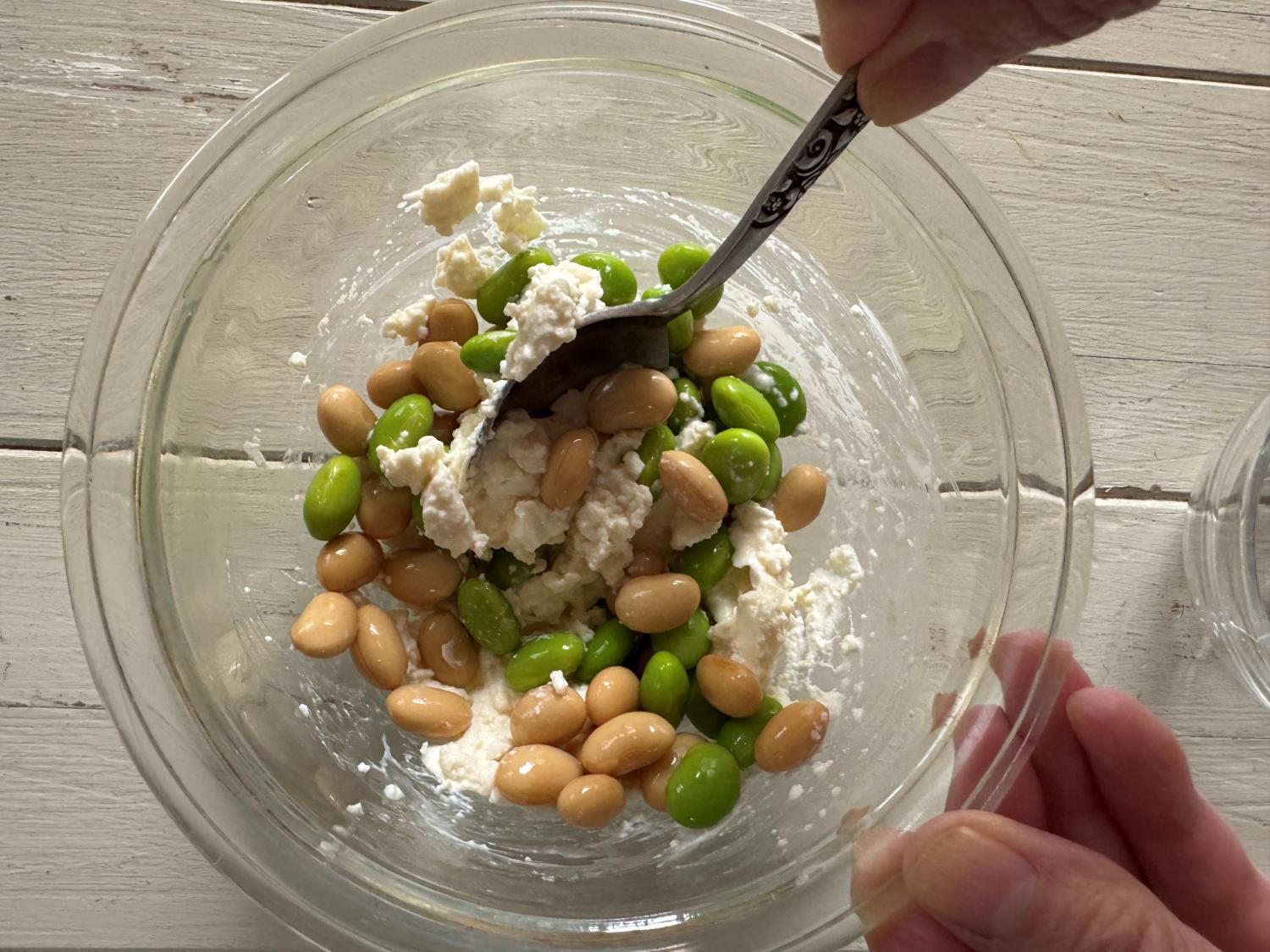 豆腐は水きりせずに、クリームチーズとよく混ぜ、そこにゆでてある大豆と枝豆を加えてさっくりあえます。