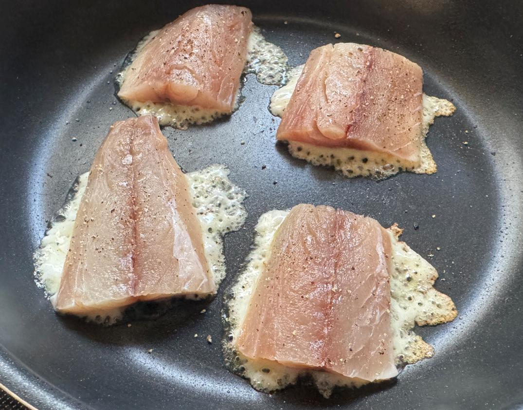2 フライパンにチーズを4カ所に置き、その上に1のアジを、皮目を下にしてのせる。