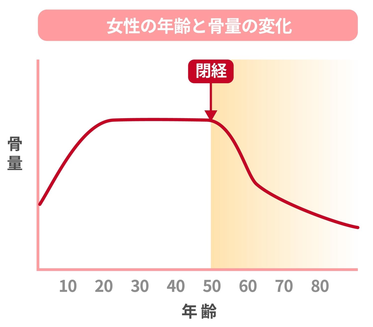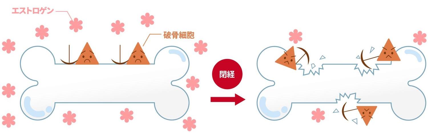 エストロゲン(女性ホルモンの一種)が減少すると、「骨が作られる速度」より「壊れる速度」のほうが上回り、骨密度が低下