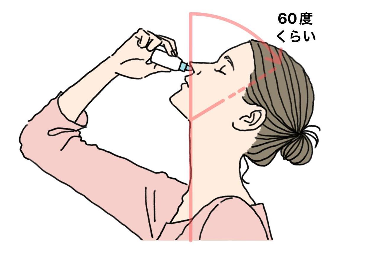 椅子に座り、頭を60度ほど後ろに倒して、片方の鼻の穴に2㎖ほどの洗浄液を入れます。洗浄液を口から出してもいいのですが、そのまま飲み込んでOK! これを左右の穴で行います。