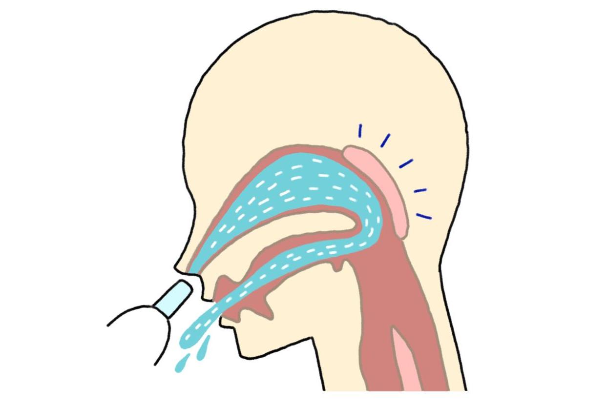 洗いたいのは『上咽頭』です。鼻うがいは片方の鼻から洗浄液を入れて、もう片方の鼻の穴から出す方法、または、口から出す方法があります。鼻に水を入れるとツーンと痛いという人が多いと思いますが、生理食塩水に近い1%程度の濃度の食塩水を用いると違和感を抑えられます。