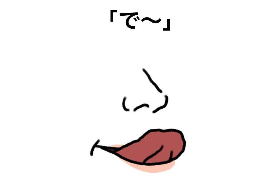 【4】「で~」:少し上を向いて下あごを突き出しながら、舌先を上に向かって突き出し、鼻につけるようなイメージで、「で~」と発音します。